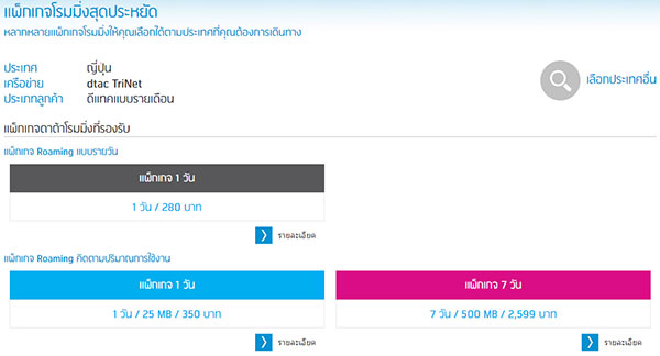 ส่วนแพ็กเก็จโรมมิ่ง (Roaming) ของ dtac นั้นก็มีให้เลือกใช้งานอยู่หลายแพ็กเกจเช่นกัน ไม่ว่าจะเป็นการใช้งานอินเทอร์เน็ตผ่านระบบเครือข่ายแบบไม่จำกัดปริมาณข้อมูล หรือคิดตามปริมาณการใช้งาน โดยจะมีให้เลือกใช้งานแบบระยะเวลาตั้งแต่ 1 วัน ไปจนถึง 7 วัน ซึ่งมีค่าใช้จ่ายต่อวัน เริ่มต้นที่ 280 บาท แต่สามารถใช้งานได้ทั้งซิมการ์ดแบบรายเดือนเพียงอย่างเดียว