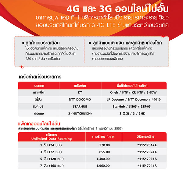 ***คำแนะนำ : ควรศึกษาแพ็กเกจโรมมิ่ง (Roaming) และเงื่อนไขการใช้งานต่างๆ ให้ดี ก่อนตัดสินใจสมัครใช้บริการ***