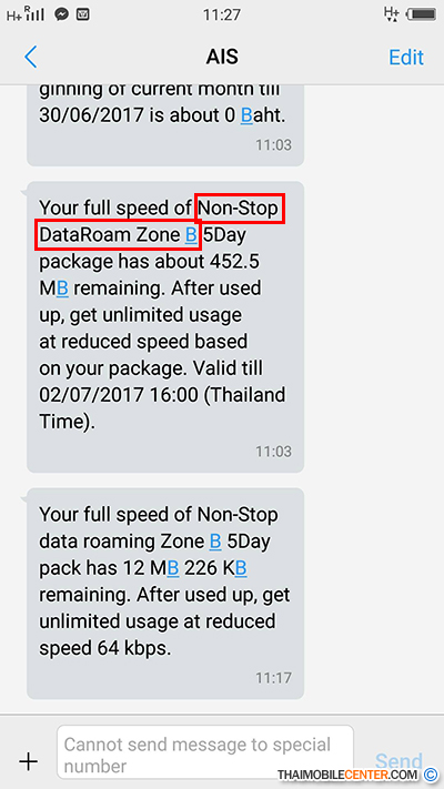 แพ็กเกจโรมมิ่ง Non-Stop Data Roaming Zone B ระยะเวลา 5 วัน ราคา 2,000 บาท (ไม่รวม VAT) ใช้อินเทอร์เน็ตเต็มสปีดได้ 2.5GB หลังจากนั้นใช้งานต่อเนื่องที่ความเร็ว 64 Kbps (ใช้งานได้กับเครือข่าย China Unicom และ China Mobile)
