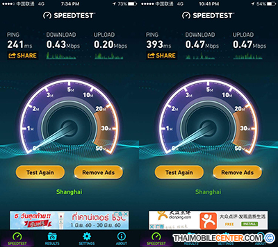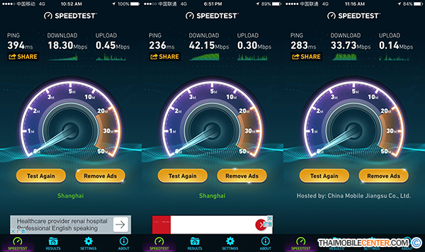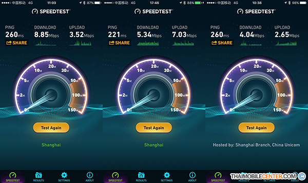 เมื่อเครื่องบินจากสายการบิน China Eastern ลงจอด ณ สนามบินผู่ตง เมืองเซี่ยงไฮ้ ตัวผู้เขียนก็ได้เริ่มเปิดใช้งาน Data Roaming ทันที ซึ่งการใช้งานช่วงแรกๆ ภายในสนามบินนั้น สัญญาณจะขาดหายเป็นช่วงๆ คาดว่าน่าจะอยู่ในจุดที่มีผู้ใช้งานเยอะ ทำให้การกระจายสัญญาณไม่ค่อยทั่วถึง แต่เมื่อเดินทางเข้าสู่ใจกลางของตัวเมืองสัญญาณก็เริ่มดีขึ้นเป็นระยะ โดยตัวผู้เขียน และทีมงานเองได้เลือกช่วงเวลาทดสอบในขณะที่สมาร์ทโฟนจับสัญญาณได้ดีที่สุดของพื้นที่นั้นๆ ซึ่งความเร็วอินเทอร์เน็ตของแต่ละค่ายมีรายละเอียด ดังนี้