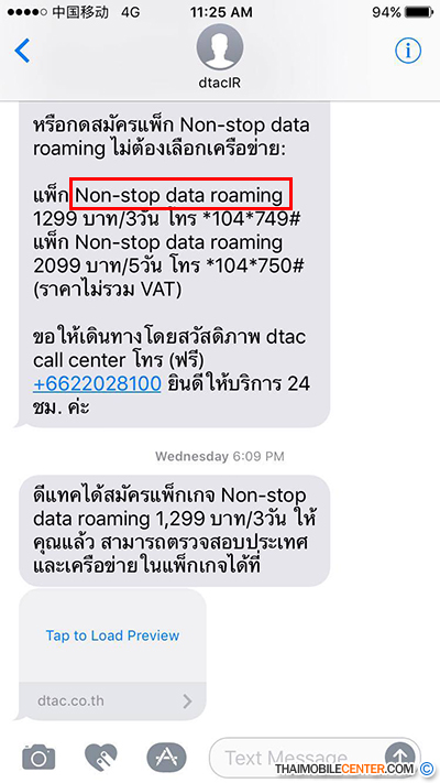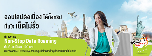 แพ็กเกจโรมมิ่ง Non-Stop Data Roaming ระยะเวลา 3 วัน ราคา 1,299 บาท (ไม่รวม VAT) ใช้อินเทอร์เน็ตเต็มสปีดได้ 100MB/วัน หลังจากนั้นใช้งานต่อเนื่องที่ความเร็ว 384 Kbps (ใช้งานได้กับเครือข่าย China Unicom และ China Mobile)