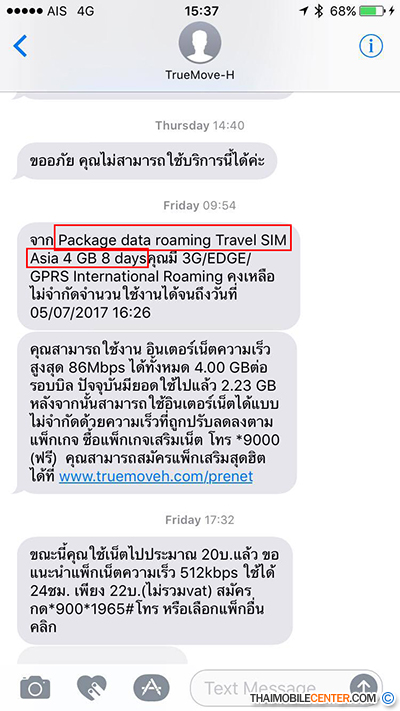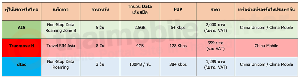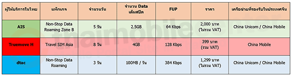 แพ็กเกจโรมมิ่ง Travel SIM Asia ระยะเวลา 8 วัน ราคา 399 บาท (รวม VAT) ใช้อินเทอร์เน็ตเต็มสปีดได้ 4GB หลังจากนั้นใช้งานต่อเนื่องที่ความเร็ว 128 Kbps (ใช้งานได้กับเครือข่าย China Mobile เท่านั้น)