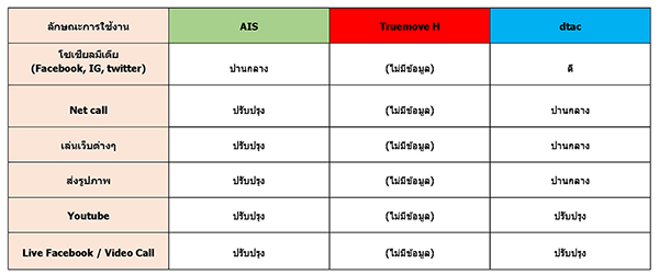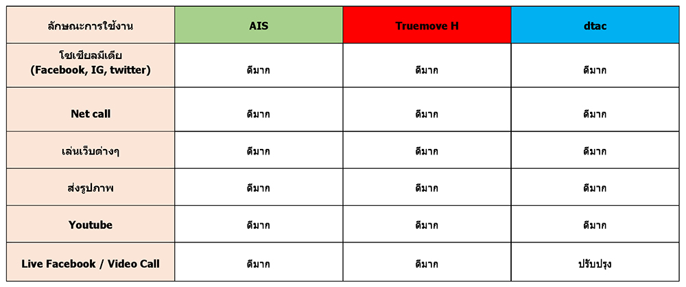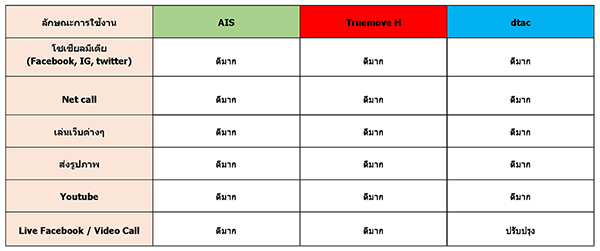 สำหรับการใช้งานของซิม AIS ค่อนข้างมีสัญญาณที่เสถียรที่สุดจากทั้ง 3 ค่าย และมีความเร็วที่ถือว่าเร็วมากๆ ด้วย โดยความเร็วของการใช้งานจะอยู่ที่ราวๆ 25 - 45 Mbps (ขึ้นอยู่กับพื้นที่ที่ใช้งาน) โดยการเล่นโซเชียล หรือดาวน์โหลดคลิปวิดีโอบน Youtube ก็ทำได้แบบลื่นไหลเป็นอย่างมาก ซึ่งทีมงานก็ใช้ซิม AIS สำหรับการไลฟ์สดถ่ายทอดบรรยากาศกลับมาให้ชมกัน ซึ่งก็ไม่มีอาการติดขัดให้เห็นแต่ประการใด แต่ก็ต้องแลกมาด้วยราคาแพ็กเกจที่ค่อนข้างสูงพอสมควรเลยทีเดียว อีกทั้งยังมีจำนวน Data มาให้ที่ 2.5GB ซึ่งถือว่าอยู่ในระดับปานกลาง หากใครที่ชอบไลฟ์บ่อยๆ หรือชอบเปิดยูทูปตลอดทั้งวันก็อาจทำให้ Data หมดไปอย่างรวดเร็วได้ เพราะทีมงานทำไลฟ์ได้ราวๆ 30 นาที ก็เสีย Data ไปประมาณ 500MB แล้ว