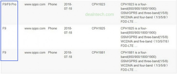 ข้อมูลการรับรอง Bluetooth เผยให้เห็นว่า OPPO F9 จะมาพร้อมกับ F9 Pro ที่คาดว่ามาพร้อมการอัปเกรดฟีเจอร์ขึ้นจากเดิมในหลายด้าน พร้อมกันนี้ก็มีการเผยภาพทีเซอร์ OPPO F9 ออกมาด้วยเช่นกัน ซึ่งแสดงให้เห็นว่า OPPO F9 จะมาพร้อมกับกล้องหลังแบบคู่ (Dual Camera) โดยไม่มีเซ็นเซอร์สแกนลายนิ้วมือด้านหลัง และมีความเป็นไปได้ว่า อาจมีการนำเทคโนโลยีการปลดล็อกด้วยใบหน้าเข้ามาใช้งานเพิ่มเติม