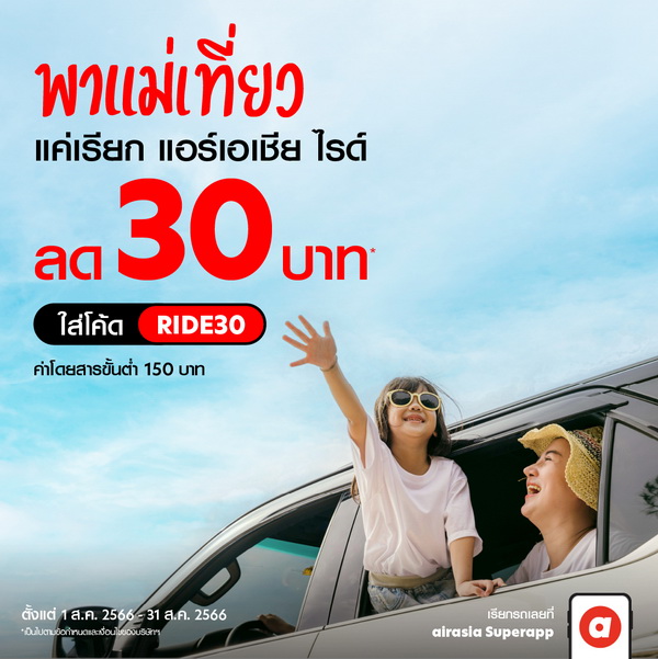 กรุงเทพ 10 สิงหาคม 2566 - airasia Superapp แอปพลิเคชั่นด้านการท่องเที่ยวและการเดินทางชั้นนำของอาเซียน ร่วมเฉลิมฉลองวันแม่แห่งชาติกับโปรนั่งร้อยลดร้อย เมื่อใช้บริการเรียกรถยนต์รับส่ง airasia ride ให้คุณและแม่ใช้เวลาสุดพิเศษเสริมความอบอุ่นในครอบครัวร่วมกันเนื่องในโอกาสพิเศษตลอดเดือนสิงหาคมนี้ ไม่ว่าจะชวนแม่เดินทางท่องเที่ยวหรือรับประทานอาหารมื้อพิเศษนอกบ้าน เพียงมียอดใช้บริการต่อครั้งตั้งแต่ 100 บาทขึ้นไป รับทันทีส่วนลด 100 บาท สำหรับใช้เป็นส่วนลดในการนั่งรถครั้งถัดไปได้ 2 ครั้ง (จำกัดสิทธิ์การใช้ส่วนลดสูงสุดครั้งละ 50 บาท) ตั้งแต่วันนี้ถึง 31 สิงหาคม 2566 ทั้งยังสามารถใช้บริการ “Dine-in Service จองร้านอาหารผ่านแอปลิเคชั่น” airasia Superapp ช่วยให้คุณและครอบครัวใช้เวลาสุดพิเศษร่วมกันได้อย่างคุ้มค่าง่ายดาย สะดวกสบายไร้รอยต่อ แถมยิ่งจองยิ่งได้คะแนน airasia points สะสมอีกด้วย ทำให้เดือนสิงหาคมของคุณเป็นเดือนสุดพิเศษที่คุ้มค่าและประหยัดสำหรับทุกคนในครอบครัว