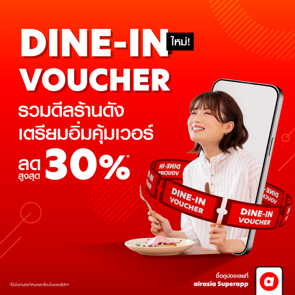 กรุงเทพ 3 ตุลาคม 2566 - airasia Superapp (ซึ่งกำลังจะเปลี่ยนชื่อเป็น airasia MOVE) ซูเปอร์แอปด้านการเดินทางและการท่องเที่ยวครบวงจรชั้นนำในภูมิภาคอาเซียนตั้งแต่การเดินทางทางอากาศและภาคพื้นดินรวมถึงบริการจองโรงแรม รุกบริการ Dine-in Voucher ตอบโจทย์สายกินทั้งชาวไทยและชาวต่างชาติที่ต้องการสัมผัสความอร่อยแบบไม่เหมือนใครกับร้านอาหารโลคัลแบบสุดเอ็กซ์คลูซีฟพร้อมราคาสุดพิเศษลดสูงสุด 50 % เพียงซื้อ Voucher ผ่านแอปพลิเคชั่น airasia Superapp (ซึ่งกำลังจะเปลี่ยนชื่อเป็น airasia MOVE) ในราคาเริ่มต้น 300 บาท ไม่ว่าจะเป็นอาหารไทย จีน ญี่ปุ่น และบุฟเฟ่ต์ พิเศษทุกๆการจองยังได้รับ airasia points โดยสามารถนำคะแนนไปใช้แทนเงินสดชำระค่าบริการหลากหลายบน airasia Superapp (ซึ่งกำลังจะเปลี่ยนชื่อเป็น airasia MOVE) ครบคุ้มทั้ง บิน-กิน-เที่ยว-พัก-ช้อป