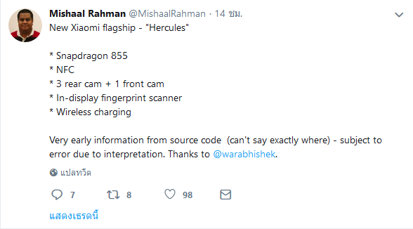 Mishaal Rahman บรรณาธิการเว็บไซต์ XDA-Developers ได้เปิดเผยข้อมูลของสมาร์ทโฟนปริศนาโค้ดเนม “Hercules” ซึ่งใช้ชิปเซ็ตรุ่นท็อป Snapdragon 855, รองรับระบบ NFC, กล้องดิจิทัลด้านหลัง 3 ตัว (Triple Camera), กล้องดิจิทัลด้านหน้า 1 ตัว, เซ็นเซอร์สแกนลายนิ้วมือใต้หน้าจอ และระบบชาร์จไร้สาย จากการสันนิษฐานเบื้องต้น เซ็นเซอร์สแกนนิ้วใต้หน้าจอและชาร์จไร้สายน่าจะทำให้สมาร์ทโฟนรุ่นนี้ราคาสูงพอสมควร และไม่น่าจะอยู่ในระดับราคาของ Pocophone หรือตระกูล Redmi จึงมีความเป็นไปได้สูงที่สมาร์ทโฟนรุ่นนี้จะเป็น Xiaomi Mi Mix 4