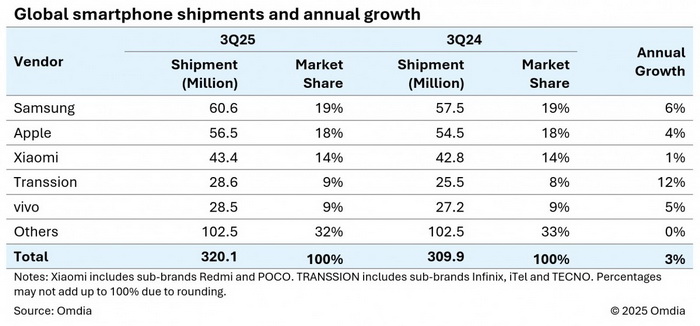 โดยรวมแล้ว ตลาดสมาร์ตโฟนทั่วโลกมียอดจัดส่งรวม 320.1 ล้านเครื่อง ในไตรมาส 3 เพิ่มขึ้น 3% เมื่อเทียบปีต่อปี โดยยอดขายในอเมริกาเหนือและจีนแผ่นดินใหญ่ลดลง ในขณะที่ภูมิภาคเอเชียแปซิฟิก ตะวันออกกลาง และแอฟริกาเติบโตอย่างแข็งแกร่ง โดยเฉพาะในแอฟริกาเพิ่มขึ้นถึง 25% และเอเชียแปซิฟิกเพิ่มขึ้น 5%