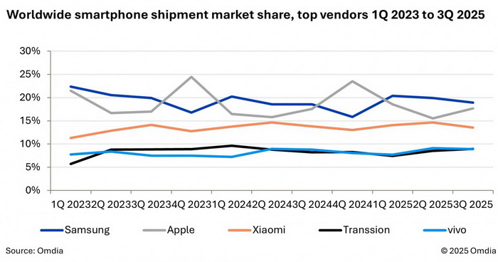 ตามมาด้วย Apple ในอันดับสอง ด้วยยอดจัดส่ง 56.5 ล้านเครื่อง ครองส่วนแบ่งตลาด 18% เติบโตขึ้น 4% เมื่อเทียบปีต่อปี ส่วน Xiaomi ครองอันดับสามด้วยยอดจัดส่ง 43.4 ล้านเครื่อง ส่วนแบ่งตลาด 14% และเติบโต 1% เมื่อเทียบปีต่อปี ขณะที่กลุ่ม Transsion (เจ้าของแบรนด์ Infinix, iTel, และ Tecno) อยู่ในอันดับสี่ ด้วยยอดจัดส่ง 28.6 ล้านเครื่อง ส่วนแบ่งตลาด 9% เติบโตสูงสุดในกลุ่มท็อปไฟว์ถึง 12% และ vivo อยู่ในอันดับห้า ด้วยยอดจัดส่ง 28.5 ล้านเครื่อง ส่วนแบ่งตลาด 9% เติบโตขึ้น 5% จากไตรมาสเดียวกันของปีที่แล้ว