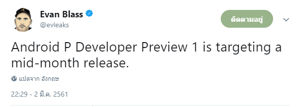 ข่าวดังกล่าวมาจาก Evan Blass เจ้าพ่อข่าวหลุดที่หลายคนคุ้นเคยกันดี ซึ่งหากเป็นไปตามนั้นจริง Android 9.0 P ก็อาจจะได้เปิดตัวอย่างเป็นทางการในงาน Google I/O ช่วงกลางปีนี้พอดี