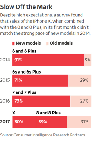 ผลสำรวจยอดขาย iPhone X และ iPhone 8 Series ในช่วงเดือนแรกของการวางจำหน่ายที่ประเทศสหรัฐอเมริกา โดยสิ้นสุดการสำรวจ ณ วันที่ 3 ธันวาคม 2560 ซึ่งผลสำรวจเปิดเผยว่า ยอดขายของ iPhone X และ iPhone 8 Series รวมกันยังมีสัดส่วนเพียง 69% เท่านั้น ซึ่งเป็นอัตราส่วนที่น้อยที่สุดในรอบ 4 ปี ที่ผ่านมาด้วย โดยในปี 2014 ที่เป็นการเปิดตัว iPhone 6 และ iPhone 6 Plus นั้น ยอดขายของไอโฟนรุ่นใหม่พุ่งสูงถึง 91% ส่วน iPhone 6s และ 6s Plus ทำยอดขายเดือนแรกไปได้ 71% และ iPhone 7 Series ทำยอดขายไปได้ 73%
