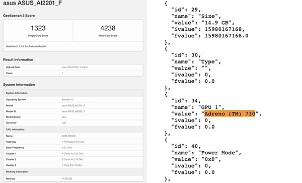 ROG Phone 6 รหัสโมเดล AI2201_F ผ่านการทดสอบบน Geekbench ด้วยคะแนน single-core 1323 คะแนน และ multi-core 4238 คะแนน โดยเครื่องที่นำมาทดสอบมี RAM 16GB และระบบปฏิบัติการ Android 12 ส่วนชิปเซ็ตประมวลผลเป็นรหัส taro ซึ่งหมายถึง Snapdragon 8+ Gen 1 ที่มากับ GPU Adreno 730 รุ่นใหม่ล่าสุด
