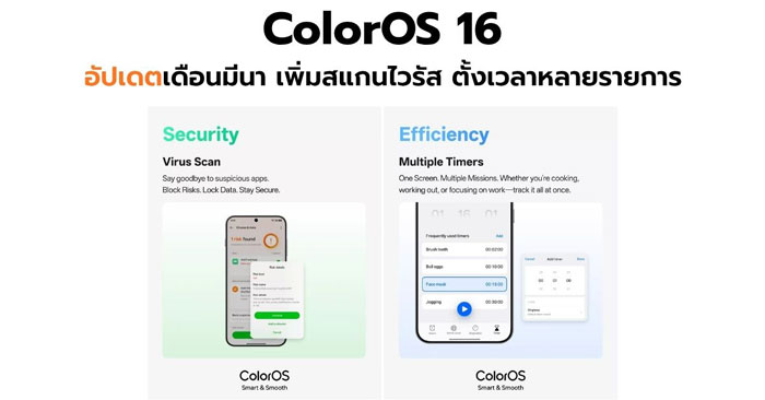 ColorOS 16 อัปเดตเดือนมีนาคม เพิ่มฟีเจอร์สแกนไวรัส ตั้งเวลาหลายรายการพร้อมกัน และปรับปรุงการใช้งานอัจฉริยะ