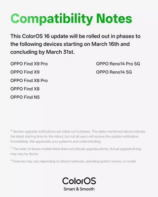 - รุ่นที่รองรับ ได้แก่ Find X9 Pro, Find X9, Find X8 Pro, Find X8, Find N5, Reno 14 Pro 5G และ Reno 14 5G