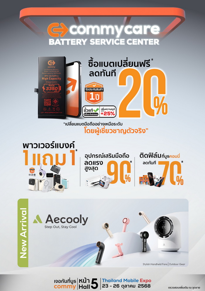 สัมผัสประสบการณ์เหนือระดับกับ “Commy Care Battery Service Center” ครั้งแรกกับศูนย์บริการเปลี่ยนแบตเตอรี่สมาร์ทโฟนและแท็บเล็ตระดับโปร ที่ยกทีมช่างผู้เชี่ยวชาญมาให้บริการภายในงานโดยเฉพาะ พร้อมพบกับผลิตภัณฑ์ใหม่ภายใต้แบรนด์ “Aecooly” พัดลมพกพาระดับพรีเมียมจากต่างประเทศ ผสานงานดีไซน์ระดับโลกเข้ากับฟังก์ชันการใช้งานที่ล้ำสมัย ตอบโจทย์ทั้งการใช้ชีวิตประจำวันและกิจกรรมกลางแจ้ง