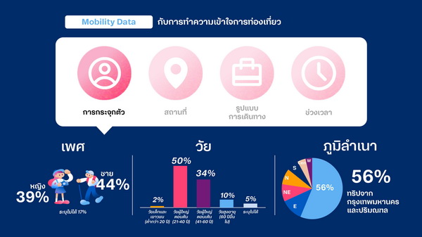 ทั้งนี้ จากการวิจัยโดยใช้ข้อมูลการเคลื่อนที่หรือ Mobility data ระหว่างเดือนมิถุนายน 2563 ถึงตุลาคม 2564* พบว่า ผู้เดินทางในภาพรวม เป็นเพศชายราว 40% เพศหญิงราว 35% และไม่ได้ระบุเพศ 25% โดยส่วนใหญ่มีถิ่นพำนักในกรุงเทพฯ ถึง 54% ทั้งนี้ นักเดินทางท่องเที่ยว 47% มีอายุระหว่าง 21-40 ปีหรือวัยผู้ใหญ่ตอนต้น ตามด้วยวัยกลางคน (41-60 ปี) มีสัดส่วนที่ 35% วัยสูงอายุ (60 ปีขึ้นไป) 14% และวัยเด็กและเยาวชน (ต่ำกว่า 20 ปี) ที่ 4% นอกจากนี้ เมื่อพิจารณาถึงลักษณะนักท่องเที่ยวในช่วงการระบาดโควิด-19 พบว่ามีลักษณะเป็นการเดินทางแบบพักค้างถึง 67% และการเดินทางแบบเช้าไปเย็นกลับ 33%