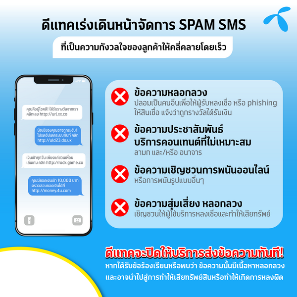 ดีแทคเร่งเดินหน้าจัดการ SPAM SMS ที่เป็นความกังวลใจของลูกค้าให้คลี่คลายโดยเร็ว