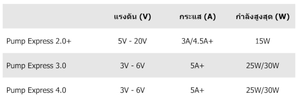 Pump Express 3.0 เข้ากันได้กับอแดปเตอร์ USB-PD ที่รองรับการจ่ายไฟ 3V ถึง 6V ที่ 5A ขึ้นไป และสายเคเบิลที่รองรับกระแสไฟ 5A ได้ ส่วน Pump Express 4.0 ก็เข้ากันได้กับอแดปเตอร์ USB-PD 3.0 เช่นกัน