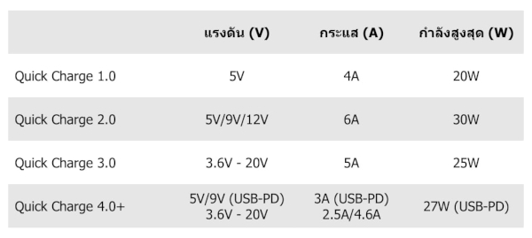 Quick Charge ชาร์จไวได้ด้วยการเพิ่มแรงดันไฟฟ้า (V) ซึ่งส่งผลให้กำลังไฟฟ้า (W) เพิ่มขึ้นตาม ระบบ Quick Charge 3.0 ที่นิยมใช้กันมากที่สุดในปัจจุบันนั้น สามารถจ่ายกระแสไฟได้ต่ำสุด 3.6V สูงสุด 20V โดยมีเทคโนโลยี Intelligent Negotiation for Optimum Voltage (INOV) คอยปรับกำลังไฟให้เหมาะสมที่สุดตามช่วงการชาร์จ โดยในช่วงพีคจะจ่ายไฟได้สูงสุด 18W ส่วนเวอร์ชั่นล่าสุดอย่าง Quick Charge 4.0+ นั้น สามารถชาร์จมือถือได้ 50% ภายในเวลา 15 นาที เร็วกว่า Quick Charge 3.0 ถึง 2 เท่า