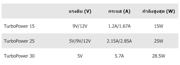 อแดปเตอร์ SuperCharge รุ่นเก่าๆ รองรับการชาร์จ 3 ระดับ ได้แก่ 5V/2A, 4.5V/5A, และ 5V/4.5A (กำลังไฟสูงสุด 22.5W) และใช้ชิปที่อยู่ในหัวชาร์จปรับกระแสไฟฟ้า ทำให้ไม่มีปัญหาเรื่องความร้อนจากการแปลงกระแสไฟ