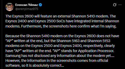 Tipster Erencan Yilmaz อ้างว่า Exynos 2600 ไม่มีโมเด็มเซลลูลาร์แบบรวมในตัวชิป แต่จะต้องพึ่งพาโมเด็มแยกต่างหาก ซึ่งเชื่อว่าเป็น Exynos 5410 ขณะเดียวกัน เจ้าหน้าที่จาก Samsung Semiconductor ได้ยืนยันกับ Android Authority แล้วว่า ชิปที่ผลิตบนกระบวนการ 2nm นี้ใช้โมเด็มภายนอกจริง