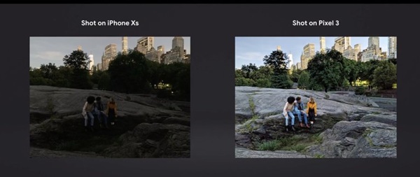 และเพื่อเป็นการเน้นย้ำถึงประสิทธิภาพของโหมด Night Sight ทาง Marvin Chow รองประธานฝ่ายการตลาดผลิตภัณฑ์ของ Google ก็ได้ปล่อยโฆษณาชิ้นใหม่ที่เผยให้เห็นภาพถ่ายเปรียบเทียบระหว่างมือถือปริศนาที่ใช้ชื่อ Phone X (Google ระบุไว้ที่มุมซ้ายล่างว่าภาพนี้ถ่ายโดย iPhone XS) และ Pixel 3 โดยใช้โหมด Night Sight พร้อมกับแคปชันภาพว่า "โหมด Night Sight ใน Pixel 3 -- ให้ภาพเล่าเรื่องดีกว่า #ทีมพิกเซล" (Night Sight on Google Pixel3 -- pretty much speaks for itself