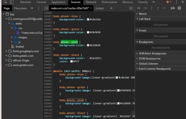 ส่วนทางด้านสีชมพูนู้ดนั้น ถูกค้นพบบนหน้าเว็บเพจ Coming Soon ของ Google หลังมีผู้ใช้รายหนึ่งได้ลองแกะ Source Code พร้อมกับเผยให้เห็นถึงสีใหม่อย่างสีชมพู แต่ตัวเฉดสีจะมีความอ่อนกว่าสีชมพูทั่วไป ซึ่งมีการคาดการณ์ว่า โทนสีอาจออกไปในแนวสีชมพูคล้ายกับสีพีชมากกว่า