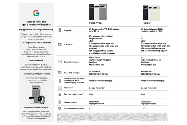 จากสเปกด้านต้นจะเห็นได้ว่า Pixel 7 Pro จะจัดเต็มกว่ารุ่นปกติทั้งในเรื่องหน้าจอที่ใหญ่กว่า และมีค่า Refresh Rate สูงกว่า ทำให้แสดงผลได้อย่างลื่นไหลมากขึ้น รวมทั้งยังมาพร้อมกับกล้องหลัง Telephoto ที่มีหน้าที่สำหรับซูมภาพโดยเฉพาะ ซูมได้ไกลสุดถึง 30 เท่า จึงทำให้ Pixel 7 Pro ดูจะเป็นมือถือที่ตอบโจทย์การถ่ายภาพแบบครอบคลุมในทุกสถานการณ์ โดยสิ่งที่ทั้งสองรุ่นมีเหมือนกันคือกล้องหน้าเซลฟี่ความละเอียด 10.8 ล้านพิกเซล, ชิปเซ็ค Google Tensor 2, บอดี้กันน้ำกันฝุ่นระดับ IP68 ไปจนถึงโหมดใหม่ Movie Motion Blur ซึ่งคาดว่าจะเป็นโหมดการถ่ายวิดีโอแบบหน้าชัดหลังเบลอ ที่ให้ความรู้สึกเหมือนการถ่ายภาพยนตร์
