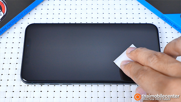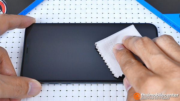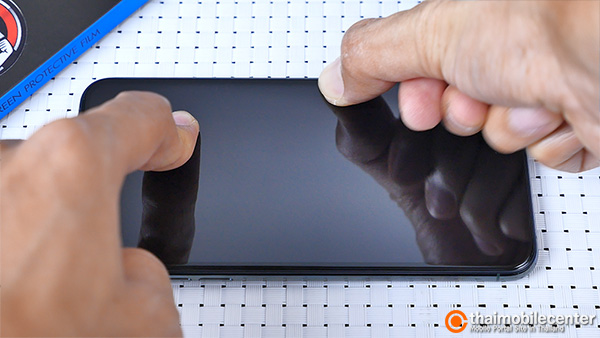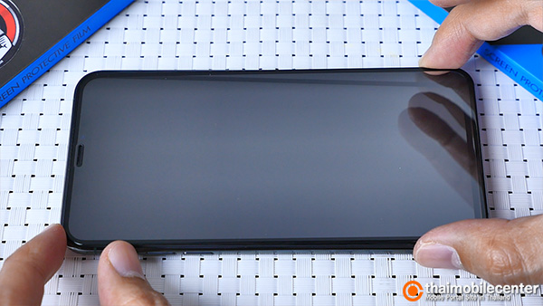 เมื่อกระจกกันรอยถูกจัดวางในตำแหน่งที่ถูกต้องเรียบร้อยแล้ว ก็ให้เราใช้นิ้วกดไปที่บริเวณส่วนกลางของแผ่นกระจก หลังจากนั้นตัวกระจกก็จะดูดติดกับหน้าจอของ iPhone 11 Pro Max โดยอัตโนมัติ