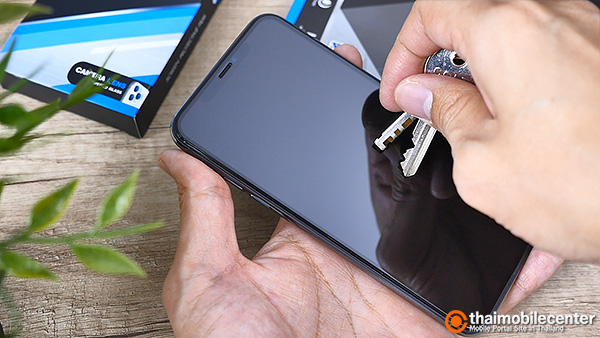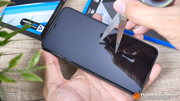 จากนั้นก็ให้นำตัวกระจกกันรอยไปทาบกับหน้าจอของ iPhone 11 Pro Max อย่างช้าๆ โดยอาจเริ่มเล็งตำแหน่งจากช่องลำโพงที่ด้านบน