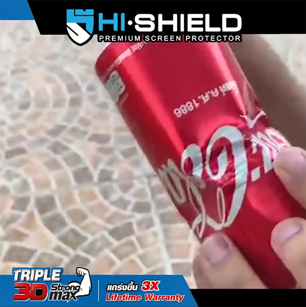 ไม่เพียงแผ่นกระจกเท่านั้นที่แข็งแกร่ง แต่ขอบกระจกก็มีความยืดหยุ่นสูง และแข็งแกร่งเป็นพิเศษเช่นกัน สามารถรับแรงกระแทกได้มากกว่ากระจกกันรอยทั่วไป โดยทาง Hi-Shield ก็ได้สาธิตด้วยการนำเอาขอบกระจก 3D Triple Strong Max ฟันเข้าไปที่กระป๋องน้ำอัดลมอย่างแรง ซึ่งผลที่ได้ก็คือ กระป๋องน้ำอัดลมบุบจนหมดสภาพ ในขณะที่ขอบของกระจกนั้นไม่พบการแตกร้าวเสียหายแต่อย่างใด