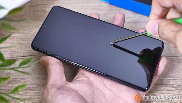 จากนั้นให้ค่อยๆ นำเอาแผ่นกระจกกันรอยวางลงไปบนกาวอย่างช้าๆ แล้วกาวก็จะกระจายตัวไปทั่วทั้งหน้าจอเองโดยอัตโนมัติ