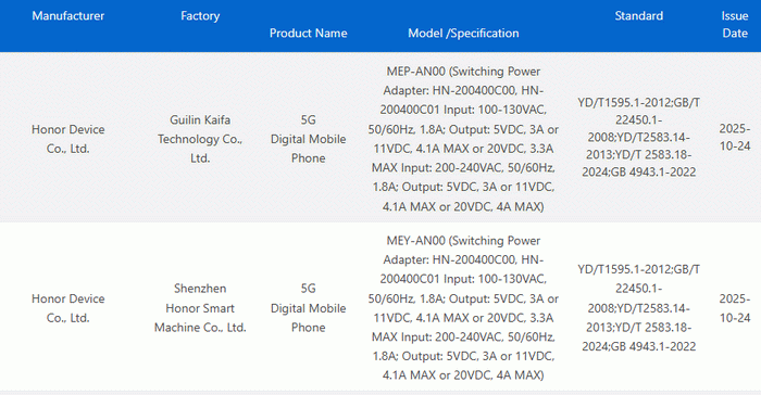 ภาพหน้าจอจากแหล่งข่าวเผยว่า สมาร์ตโฟน 2 รุ่นใหม่ของ HONOR ที่มีหมายเลขโมเดล MEP-AN00 และ MEY-AN00 ได้รับการอนุมัติจากหน่วยงาน 3C Certification แล้ว โดยมีชื่อรหัสว่า “Merry” และ “MerryP” ทั้งสองรุ่นรองรับที่ชาร์จความเร็วสูง 80W ซึ่งบ่งชี้ว่าอาจเป็น HONOR 500 และ HONOR 500 Pro ที่จะเปิดตัวในเดือนพฤศจิกายนนี้ในประเทศจีน