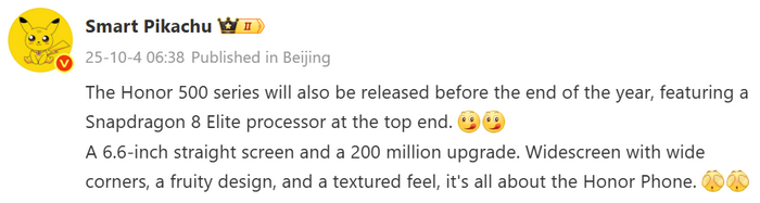 มีรายงานว่า HONOR กำลังพัฒนาสมาร์ตโฟนรุ่นใหม่หลายรุ่นสำหรับตลาดจีน โดยในขณะที่บริษัทเตรียมเปิดตัวซีรีส์ HONOR Magic 8 ภายในกลางเดือนตุลาคม ก็มีข่าวว่ากำลังเตรียมเปิดตัวซีรีส์ HONOR GT 2 และ HONOR 500 ด้วย ล่าสุดมีข้อมูลหลุดจากแหล่งข่าว Smart Pikachu เปิดเผยรายละเอียดสำคัญของรุ่นที่คาดว่าเป็น HONOR 500 Pro