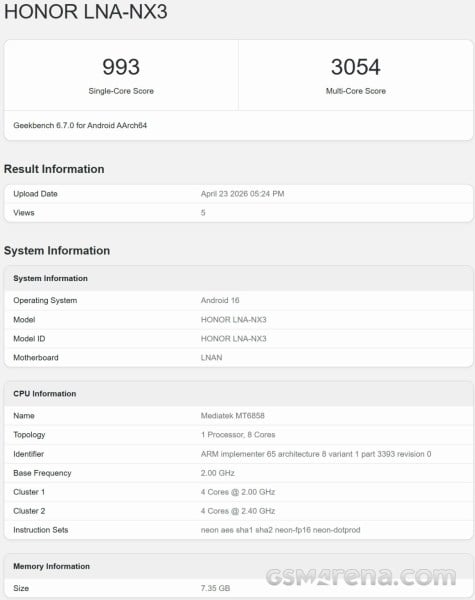 HONOR รหัสโมเดล LNA-NX3 ทำคะแนนบน Geekbench ได้ 993 คะแนนในการทดสอบแบบ Single-Core และ 3,054 คะแนนในการทดสอบแบบ Multi-Core โดยรันระบบปฏิบัติการ Android 16 และใช้ชิปประมวลผล Octa-Core ของ MediaTek รหัส MT6858 ซึ่งมีความเป็นไปได้ว่าอาจเป็นชิป Dimensity 7100