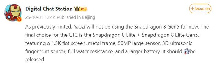 ตามข้อมูลจาก DCS ระบุว่า HONOR GT 2 จะขับเคลื่อนด้วยชิป Snapdragon 8 Elite (รุ่นปีที่แล้ว) ส่วน HONOR GT 2 Pro จะมาพร้อมชิปรุ่นใหม่ล่าสุด Snapdragon 8 Elite Gen 5 ที่ให้ประสิทธิภาพสูงกว่าและรองรับเทคโนโลยีล่าสุดของ Qualcomm