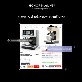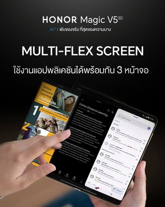 ในด้านการทำงาน HONOR Magic V5 มอบประสบการณ์มัลติทาสก์ที่ก้าวล้ำยิ่งขึ้นด้วย Gemini Live ผู้ช่วยอัจฉริยะที่ช่วยให้การประชุมออนไลน์ การแปลภาษา และการทำงานร่วมกันเป็นเรื่องง่ายและมีประสิทธิภาพมากกว่าเดิม ควบคู่กับ Multi-flex screen ที่ออกแบบมาเพื่อการแบ่งหน้าจอและใช้งานถึง 3 แอปพร้อมกันได้อย่างลื่นไหลไม่ว่าจะทำงานเอกสาร ตรวจสอบอีเมล ดูวิดีโอ หรือเล่นเกม ก็สามารถจัดการได้พร้อมกันโดยไม่สะดุด