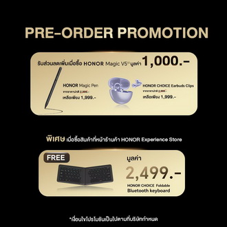 HONOR Magic V5 เปิดตัวในราคา 57,990 บาท Pre-order วันนี้ – 29 สิงหาคม 2568 รับสิทธิ์ส่วนลดเพิ่มทันที 7,000 บาท เมื่อใช้สิทธิ์เก่าแลกใหม่ (เฉพาะร้านค้าตัวแทนจำหน่ายที่ร่วมรายการ) รับส่วนลด 1,000 บาท เมื่อซื้อ HONOR Magic Pen จากราคา 2,999 บาท เหลือเพียง 1,999 บาท และส่วนลด 1,000 บาท เมื่อซื้อ HONOR CHOICE EARBUDS CLIP จากราคา 2,999 บาท เหลือเพียง 1,999 บาท พร้อมประกันพิเศษ อาทิ ประกันเสียไม่ซ่อม เปลี่ยนเครื่องใหม่ทันทีใน 90 วัน, ขยายประกันตัวเครื่องจาก 1 ปี เป็น 2 ปี และประกันหน้าจอแตก 180 วัน รวมถึงพิเศษเฉพาะเมื่อซื้อ HONOR Magic V5 ที่ HONOR Experience Store แถมฟรี HONOR Choice foldable Bluetooth Keyboard มูลค่า 2,499 บาท เริ่มวางจำหน่ายตั้งแต่วันที่ 30 สิงหาคม 2568 เป็นต้นไป