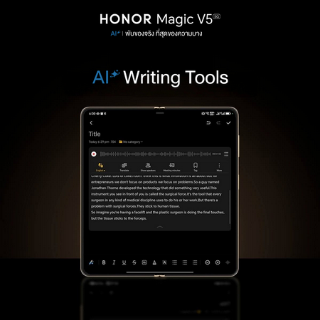 HONOR Magic V5 มาพร้อม Advance AI Writing Tools พัฒนาร่วมกับ Google Gemini ให้ผู้ใช้สร้างเนื้อหาตามต้องการได้ทันที ผ่านการป้อนข้อความหรือคำสั่ง ฟีเจอร์รองรับการใช้งานหลายรูปแบบ อาทิ Smart Creation สร้างสรรค์เนื้อหาอัตโนมัติ Polishing and Rewriting ปรับปรุงหรือเขียนใหม่ให้เนื้อหาไหลลื่นCorrection ตรวจสอบและแก้ไขข้อความ Advance AI Check Spelling and Grammar ตรวจแกรมม่าและไวยากรณ์หลายภาษา และ Advance AI Rewrite Style ช่วยปรับแต่งพารากราฟหรือบทความให้เป็นสไตล์ใหม่แบบแอดวานซ์ ฟีเจอร์เหล่านี้ช่วยให้ผู้ใช้ทำงานด้านการเขียนได้ รวดเร็ว สร้างสรรค์ และมีประสิทธิภาพมากขึ้น