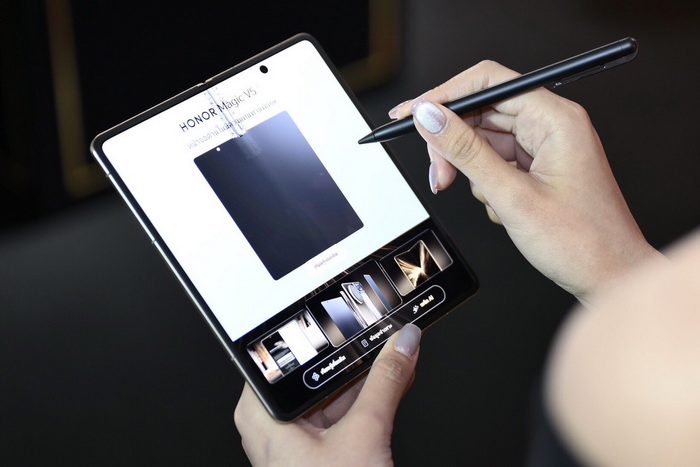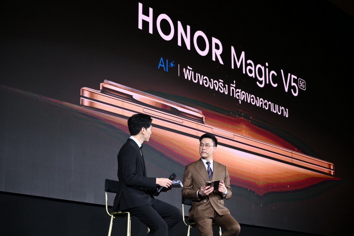ด้าน นายพลภัทร์ สายบัวทอง ประธานเจ้าหน้าที่ฝ่ายปฏิบัติการ บริษัท ออเนอร์ ประเทศไทย กล่าว เสริมว่า “วันนี้ผมภูมิใจที่จะประกาศว่า เราทำสำเร็จแล้วกับการเปิดตัว HONOR Magic V5 อุปกรณ์ที่ไม่ใช่เพียงสมาร์ตโฟนจอพับ แต่คือนิยามใหม่ของอุตสาหกรรม ด้วยการเป็นสมาร์ตโฟนจอพับที่ทั้งบางและเบาที่สุด ซึ่งเกิดจากการผสานเทคโนโลยีหลัก 3 ประการเข้าด้วยกันอย่างลงตัว ได้แก่ เทคโนโลยีแบตเตอรี่ขั้นสูง ที่พัฒนาสถาปัตยกรรมใหม่ให้เล็กลงแต่ยังคงทรงพลัง การผลิตที่ขับเคลื่อนด้วย AI ช่วยเพิ่มความแม่นยำตั้งแต่การเลือกวัสดุจนถึงการประกอบและควบคุมคุณภาพ ทำให้แข็งแกร่งและเชื่อถือได้ วัสดุใหม่เพื่ออนาคต ที่ทั้งแข็งแรง ทนทานต่อการพับ และมีน้ำหนักเบา ทำให้พกพาสะดวกยิ่งกว่าเดิม”
