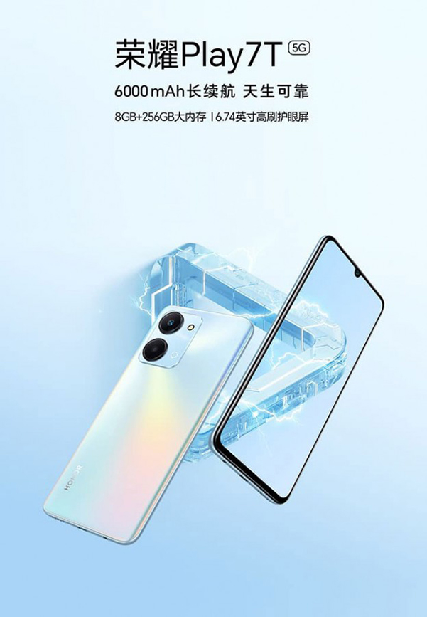 Honor Play 7T มีหน้าจอ IPS LCD 6.74 นิ้ว คมชัดระดับ HD+ รองรับอัตรารีเฟรชภาพที่ 90Hz พร้อมโมดูลกล้องหน้ารูปทรงหยดน้ำ ติดตั้งกล้องหน้าความละเอียด 5MP ส่วนด้านหลังมีชุดกล้องหลังคู่ที่ประกอบด้วย กล้องหลัก 50MP + กล้อง Depth 2MP ใช้ชิป MediaTek Dimensity 6020 รันบนระบบปฏิบัติการ Android 12 ครอบทับด้วย Magic UI 6.1 มีแบตเตอรี่ความจุขนาด 6,000 mAh รองรับชาร์จไว 22.5W พร้อมเซนเซอร์แสกนลายนิ้วมือด้านข้าง และช่องใส่หูฟัง