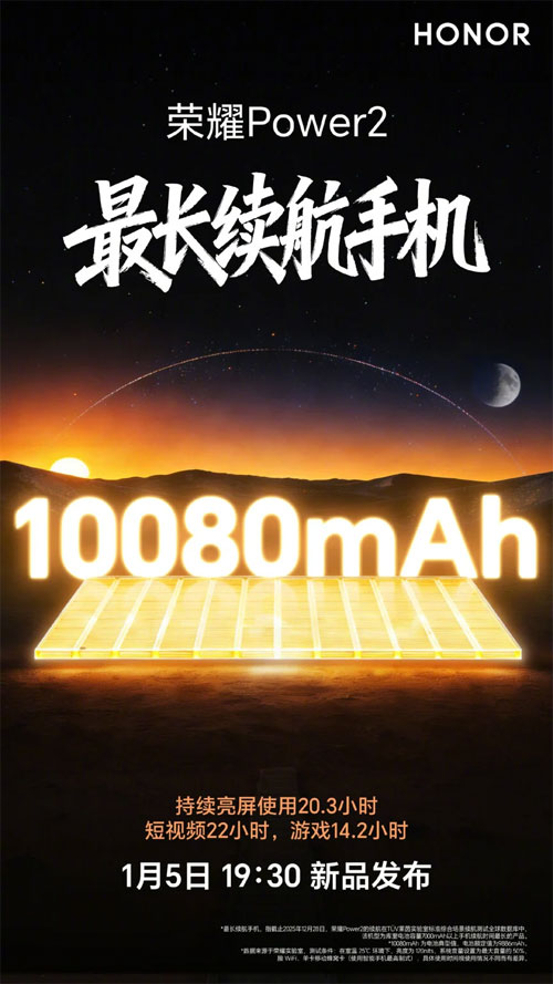 จากโปสเตอร์ยืนยันว่า HONOR Power 2 จะมาพร้อมแบตเตอรี่ 10,080mAh ซึ่งถือเป็นมือถือแบตใหญ่ที่สุดของ HONOR ในตอนนี้ และแบรนด์เคลมว่าใช้งานได้ยาวนาน ได้แก่