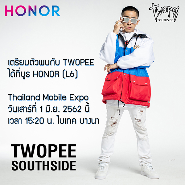**ไฮไลท์สุดพิเศษพบกับ ‘โต้ง Twopee’ ที่จะมาโชว์ลีลาแร็ปสุดเท่ในวันเสาร์ที่ 1 มิถุนายน 2562 ตั้งแต่ 15.20– 16.20 น. ณ บูธออเนอร์ L6 กิจกรรมสุดพิเศษเฉพาะลูกค้าออเนอร์ 5 ท่าน!! มีสิทธิ์ร่วมชมมินิคอนเสริต์อย่างใกล้ชิดและรับของรางวัล Honor Sport Bluetooth Earphones มูลค่า 1,290 บาท เพียงแสดงใบเสร็จหลักฐานการซื้อสมาร์ทโฟนออเนอร์รุ่นใดก็ได้ จำกัดการลุ้นรับสิทธิ์ 1 ท่าน ต่อ 1 เครื่อง ภายในงาน Thailand Mobile Expo 2019 ตั้งแต่วันที่ 30 พฤษภาคม – 1 มิถุนายน 2562 (หมดเขตลงทะเบียนเวลา 13.00 น.) และนำใบเสร็จมาลงทะเบียนที่บูธออเนอร์ L6 โดยออเนอร์จะสุ่มเลือกและประกาศรายชื่อผู้มีสิทธิ์ 5 ท่าน ในวันที่ 1 มิถุนายน 2562 เวลา 13.20 น.ที่บูธออเนอร์ และ Facebook HONOR Thailand www.facebook.com/HonorThai/ พิเศษแบบนี้เรียกได้ว่าสายแร็ปเปอร์หรือใครที่ชื่นชอบเพลงฮิปฮอปห้ามพลาด!