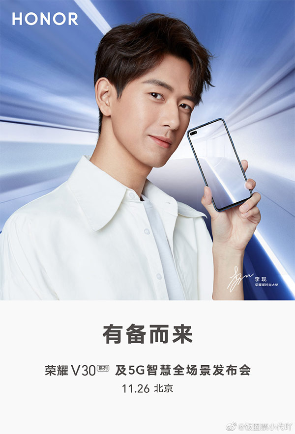 Honor V30 ว่าที่เรือธงรุ่นใหม่ยืนยันเปิดตัว 26 พ.ย. นี้ พร้อมโชว์ดีไซน์จอเจาะรูกล้องหน้าคู่ชัดเจน คาดมากับชิป Kirin 990 ตัวท็อป พร้อมแบตใหญ่ 4200 mAh ชาร์จไว 40W และกล้อง 4 ตัว 60MP