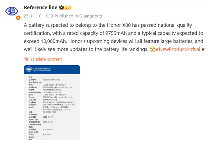 นอกจากนี้ แหล่งข่าวด้านเทคโนโลยีในประเทศจีนยังเปิดเผยเพิ่มเติมว่า แบตเตอรี่ของ HONOR X80 ได้รับการรับรองจากหน่วยงาน 3C (China Compulsory Certification) แล้ว โดยมีความจุจริง 9,755mAh และคาดว่าค่ามาตรฐาน (Typical Value) จะเกิน 10,000mAh ซึ่งสอดคล้องกับข้อมูลจาก Digital Chat Station ที่ระบุว่ารุ่นนี้คือ HONOR X80 ซึ่งจะมาแทนที่ HONOR X70 ที่เปิดตัวไปเมื่อเดือนกรกฎาคม 2025