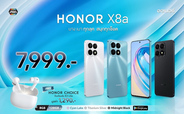 HONOR X8a นำเสนอประสบการณ์ใหม่ในดีไซน์ทันสมัย ให้คุณเลือกนำเทรนด์ก่อนใครใน 3 สีสันโดดเด่น[9] ได้แก่ สีน้ำเงิน Cyan Lake ใหม่ล่าสุด, สีเงิน Titanium Silver และ สีดำ Midnight Black ให้ทุกท่านได้เป็นเจ้าของในราคาสุดคุ้มค่าเพียง 7,999 บาท บนแพลตฟอร์ม Lazada รวมถึงร้านค้าตัวแทนจำหน่าย HONOR ที่ร่วมรายการทั่วประเทศ และช่องทางร้านค้าออนไลน์ทุกแพลตฟอร์ม ทั้งนี้ ทาง HONOR ยังการันตีคุณภาพด้วยบริการหลังการขาย Trusted by Synnex กว่า 11 ศูนย์บริการ ทั่วประเทศ พร้อมบริการ Door to Door Service ผ่านเบอร์ติดต่อ 1251 ที่ให้ลูกค้ามั่นใจหายห่วงตลอดการใช้งานอย่างแน่นอน