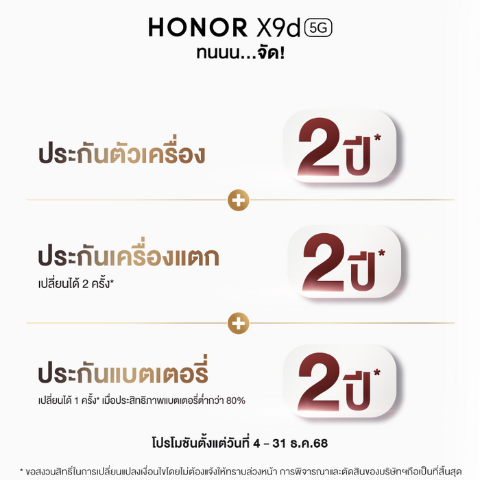 ออเนอร์ (HONOR) เดินหน้ารุกตลาดสมาร์ตโฟนไทย ส่งท้ายปีด้วยการเปิดตัว HONOR X9d 5G อย่างเป็นทางการ ภายใต้สโลแกน “ทนนน...จัด!” โดยสมาร์ตโฟนรุ่นนี้สร้างมาตรฐานใหม่ให้เป็นสมาร์ตโฟนระดับกลางที่ทรงพลังที่สุดในตลาด โดดเด่นด้วยโครงสร้างสุดแข็งแกร่ง รองรับการตกกระแทกสูงสุด 2.5 เมตร พร้อมผ่านมาตรฐานกันน้ำกันฝุ่นระดับสูงสุดครอบคลุมทั้ง IP69K, IP69, IP68 และ IP66 ผสานสมรรถนะด้านการใช้งานเหนือชั้นด้วยแบตเตอรี่ขนาด 8,300mAh ซึ่งเป็นความจุที่ใหญ่ที่สุดในตลาดสมาร์ตโฟนปัจจุบัน ขณะที่ด้านการถ่ายภาพมาพร้อมกล้อง AI Camera อัจฉริยะ ความละเอียด 108MP เสริมด้วยระบบกันสั่นคู่ OIS + EIS ช่วยให้ผู้ใช้เก็บภาพได้คมชัดทุกสภาพแสง ด้วยการออกแบบที่ตอบโจทย์ทุกความต้องการของผู้ใช้รุ่นใหม่ ทั้งความทนทาน ประสิทธิภาพ และประสบการณ์การถ่ายภาพที่ครบเครื่อง HONOR X9d 5G จึงนับเป็นหนึ่งในสมาร์ตโฟนระดับกลางที่คุ้มค่าที่สุดในตลาด เปิดตัวในราคา 11,990 บาท นอกจากนี้ ยังสร้างสีสันด้วยการดึงศิลปินลูกทุ่งชื่อดัง ‘ก้อง ห้วยไร่’ กลับมาเป็นพรีเซนเตอร์ และ HONOR’s Friend เป็นปีที่สอง เพื่อสะท้อนภาพลักษณ์ความแกร่ง คุ้มค่า และเข้าถึงผู้ใช้ทุกกลุ่มได้อย่างลงตัว
