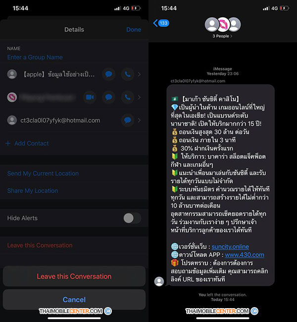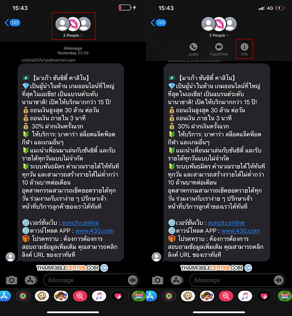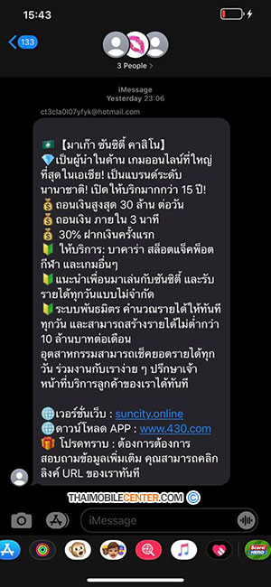 คงจะเป็นข้อความสแปมที่กวนใจผู้ใช้ iPhone กันอยู่ในตอนนี้ สำหรับข้อความจากผู้ส่งที่ใช้ชื่อว่า มาเก๊า ซันซิตี้ คาสิโน ที่สร้างคำถามคาใจว่า ข้อความดังกล่าวส่งมาจากใคร ซึ่งจากที่ทีมงานได้ค้นหาข้อมูลในเบื้องต้น พบว่า ไม่เกี่ยวข้องกับผู้ให้บริการเครือข่าย 3 ค่ายหลัก และไม่เกี่ยวกับการเข้าใช้งานแอปพลิเคชัน ไทยชนะ แต่อย่างใด เนื่องจากมีผู้ใช้งานจำนวนไม่น้อยที่ไม่เคยใช้งานแอปฯ ไทยชนะมาก่อน แต่ก็ยังได้รับข้อความสแปมดังกล่าว อีกทั้งยังไม่มีผู้ใช้งาน Android ได้รับข้อความนี้เช่นกัน ทำให้คาดว่า น่าจะเกิดจากความผิดพลาดของแอปฯ iMessage บน iPhone เสียมากกว่า