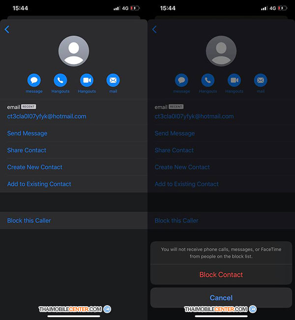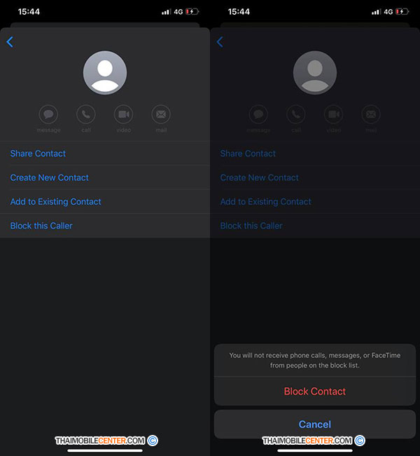 เมื่อกดเข้าไป จะปรากฏรายชื่อของคนที่ส่งข้อความมา ให้กดเข้าไปที่ชื่อแต่ละคน แล้วเลือก Block Contact