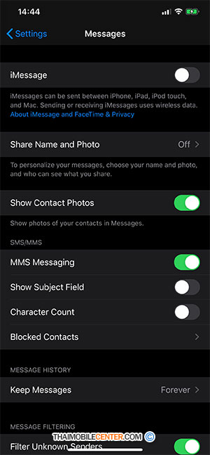 ถ้าหากทำตาม 2 วิธีข้างต้นแล้วยังไม่ได้ผล วิธีสุดท้ายก็คือ ให้ปิดฟังก์ชัน iMessage ชั่วคราวไปก่อน ด้วยการเข้าไปที่ Settings > Messages แล้วเลือกปิด toggle ตรง iMessage